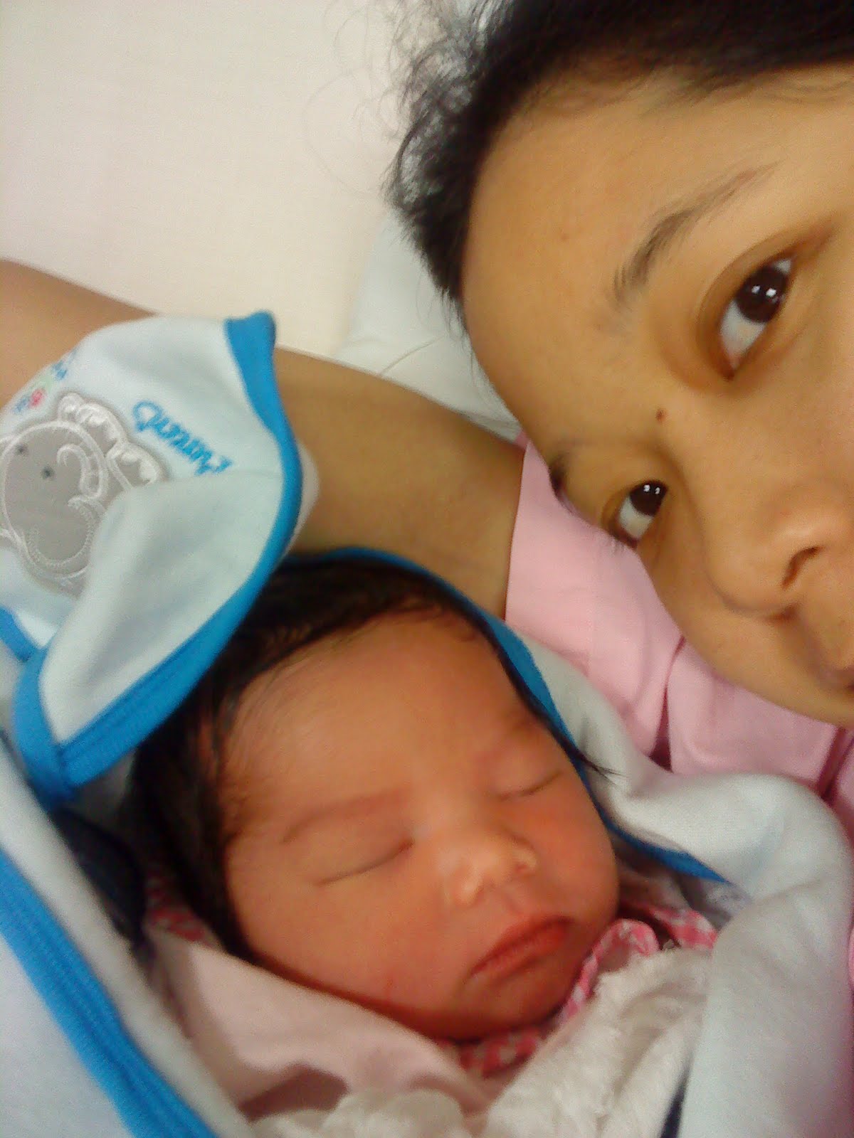 di dalam ruang menunggu, kontraksi telah selang 5 minute. aku memanggil nurse untuk melihat keadaana ku. setelah doktor melihat bukaan aku sudah 6cm, aku diletakkan di labour room. saat nie aku rasa memang terseksa sungguh.dengan rasa sakit di perut..sakit di belakang, rasa macam nak tercabut kakinya..semuanya serba tak kena..5 jam menahan rasa sakit setelah air ketuban pecah, tapi bukaan di bawah tetap tidak terbuka lagi..tetap 6cm sejak pukol 10pm..rasa tak tahan sangat aku minta pada nurse untuk dapatkan epidural tapi nurse beritahu yang doktor untuk menyuntik epidural takder..time tu aku rasa dah menagis tak ingat..sakit hanya Allah yang tahu dan mereka-mereka yang pernah melahirkan anak sahaja yang tahu keperitan untuk melahirkan anak nie macam mana. sakit tak ingat.